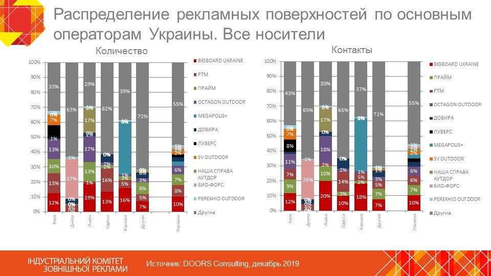 В отчете отдельно показаны данные по декабрю 2019 г., поскольку в результате трансформационных процессов в наружной рекламе и добавления в мониторинг и анализ цифровых панелей претерпел изменения список рекламных операторов по количеству инвентаря. Сегодня ТОП-4 операторов рынка и их доли в количестве плоскостей: BigBoard Ukraine — 10 %; РТМ-Украина — 8 %, PRIME Groupe — 7 %, Octagon Outdoor — 6 %. В декабре 2019 цифровые панели занимали почти 3 % среди всех форматов украинского Outdoor-рынка с прогнозируемой тенденцией к более чем 100%-ному ежегодному росту. Что позволяет говорить о стремительном развитии Digital Outdoor, ведь на начало прошлого года количество цифрового инвентаря не превышало нескольких десятков поверхностей, а сами панели не были представлены в исследованиях и мониторинге внешней рекламы.