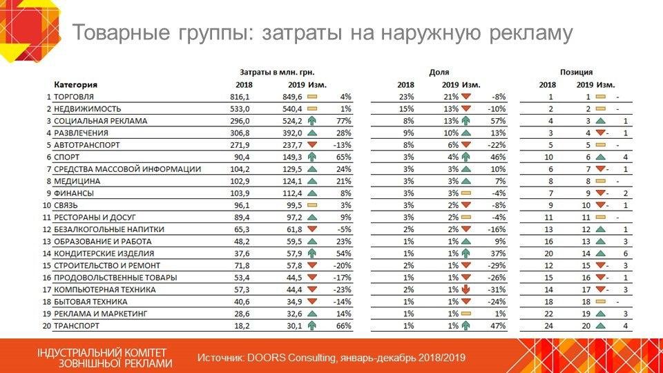 По результатам года на 1-м месте среди категорий рекламодателей — Торговля, на 2-м месте — категория «Недвижимость». Социальная реклама, лидировавшая в 1-м полугодии 2019 г. благодаря политическим кампаниям, по итогам года на 3-й строчке рейтинга ведущих категорий рекламодателей.