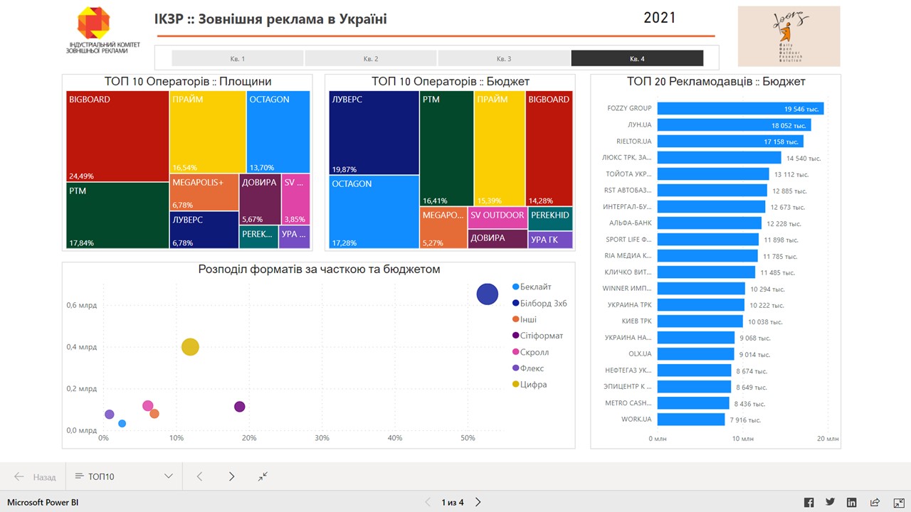 Деталізація змін за кварталами доступна у звіті Індустріального комітету зовнішньої реклами у форматі PowerBI за цим посиланням. А також дані щодо розподілу рекламних бюджетів за містами, форматами, рекламодавцями і брендами в динаміці за 4 квартали 2021 р.